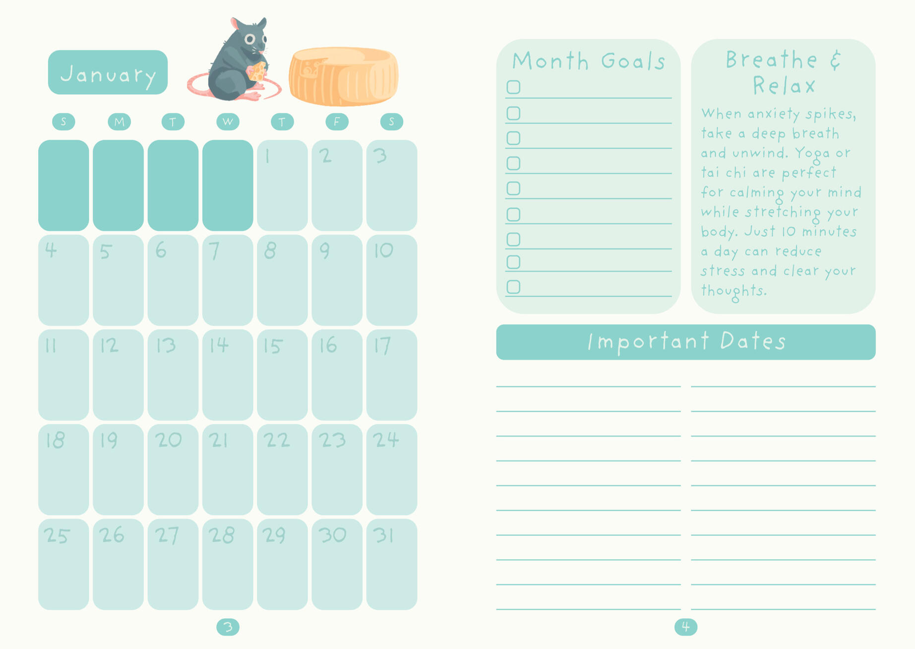 The planner included to-do lists, goal-setting prompts, and short blurbs of mental health advice—all wrapped in bright, comforting illustrations. My goal was to make planning feel less overwhelming and a lot more joyful.